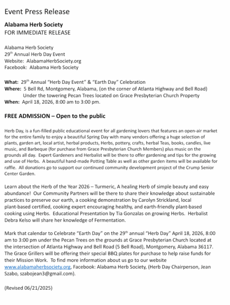 The 28th Annual Herb Day will be held Saturday, April 26, 2025, on the grounds of Grace Presbyterian Church, corner of Atlanta Highway and Bell Rd. Activities have been modified to honor our health and well-being.