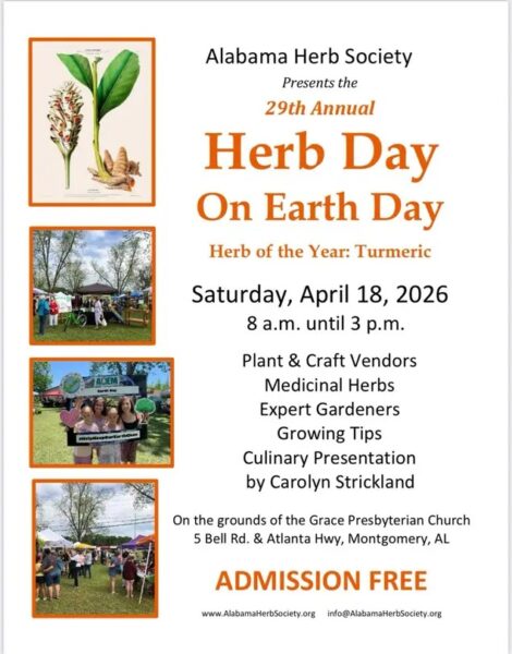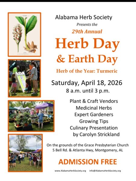 Herb Day is held annually, on a spring Saturday, from 8:00 a.m. to 3:00 p.m. in Montgomery, Alabama.
